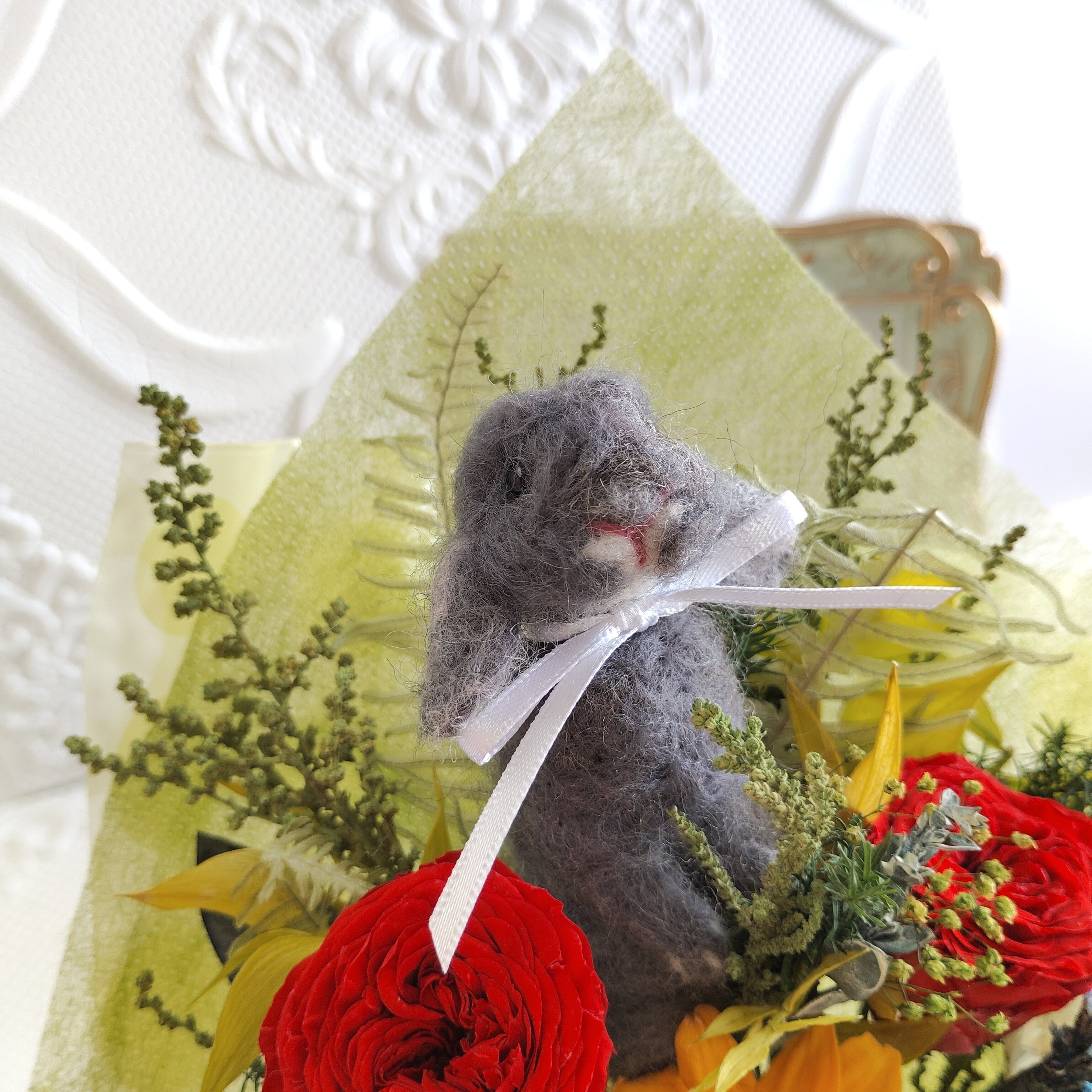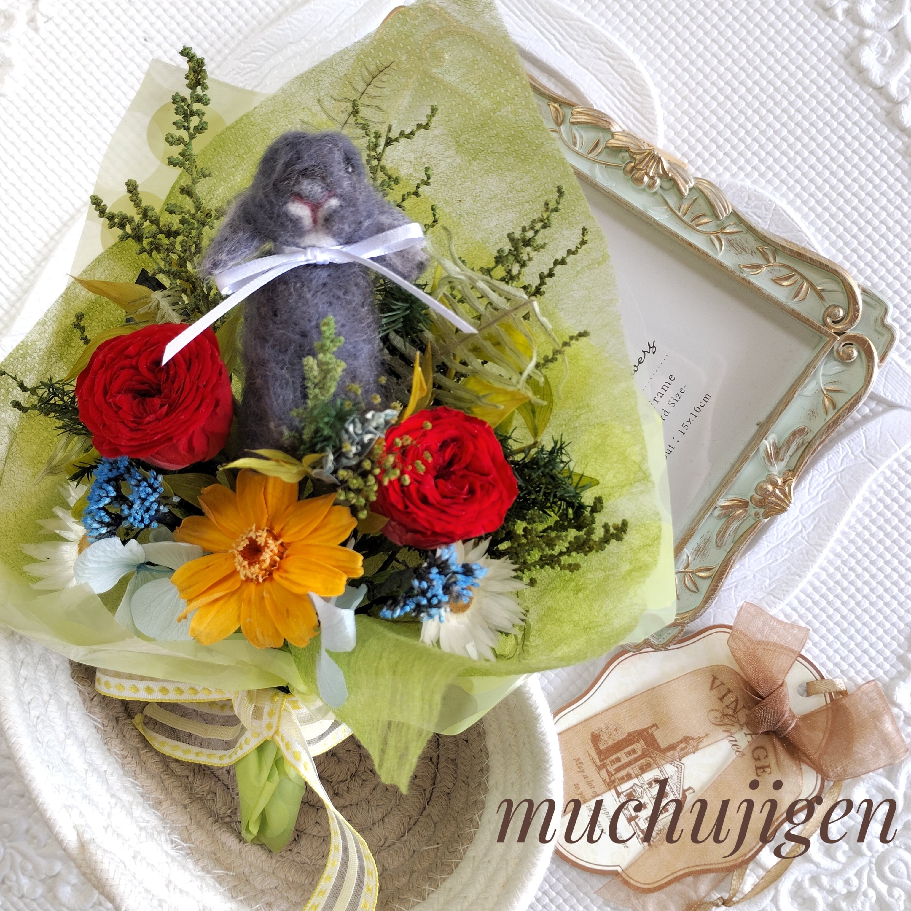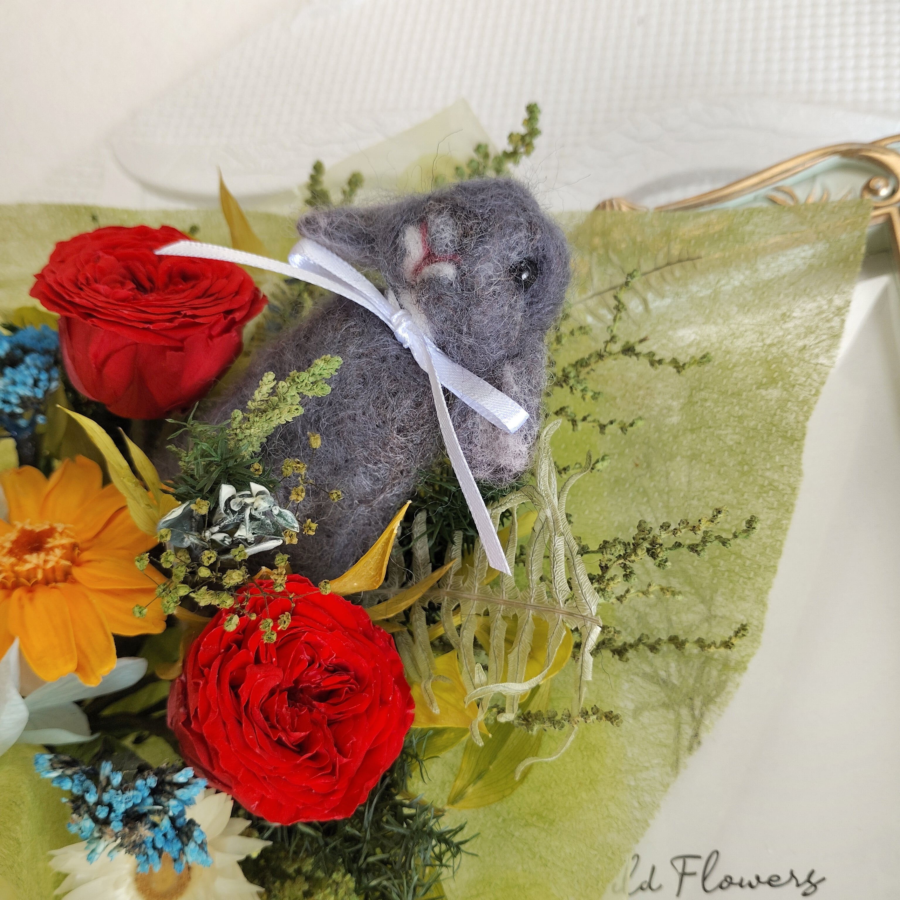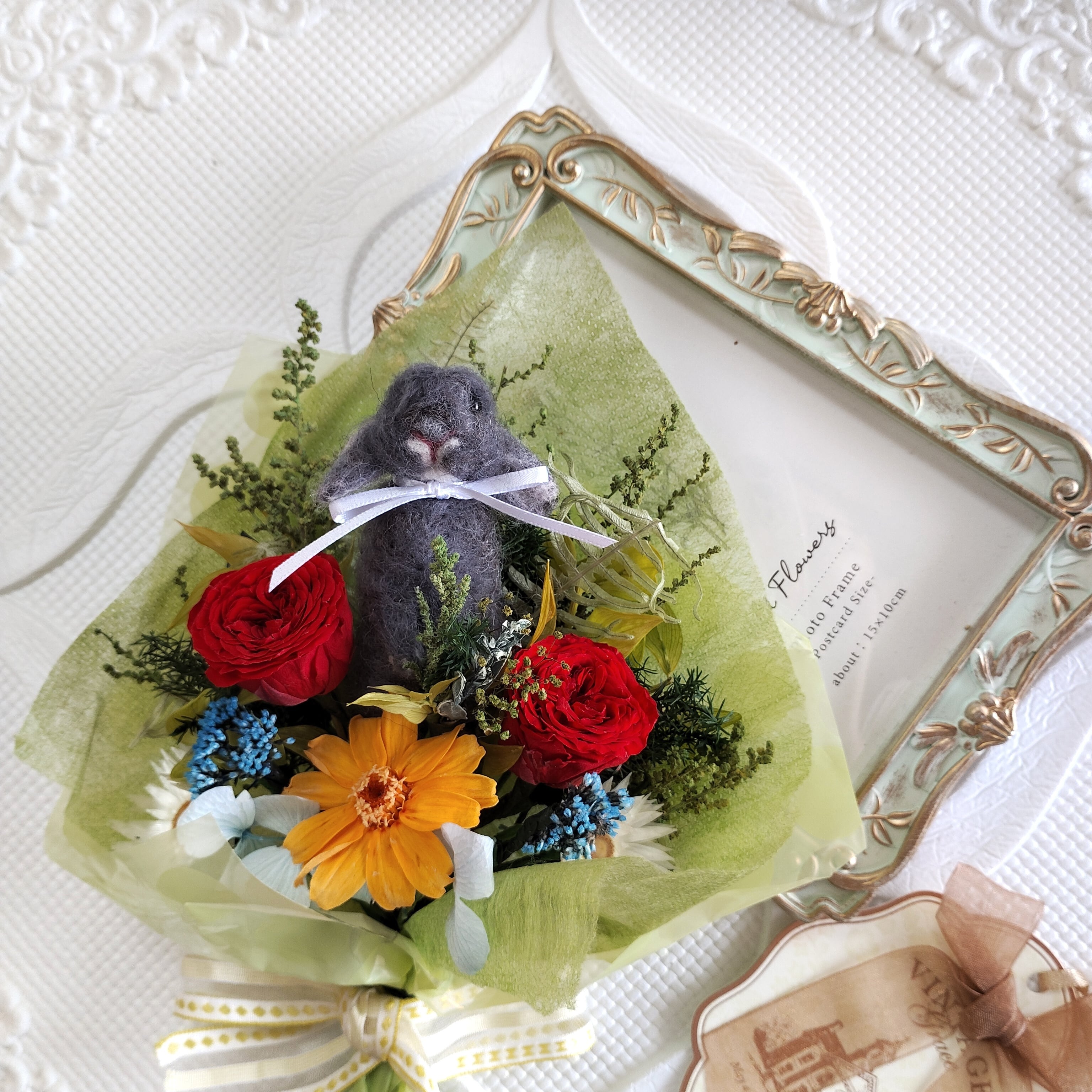 艶やかさに包まれて。たれ耳うさぎさんのブーケ/羊毛フェルト/プリザーブドフラワー/◆【宅急便・送料別】◆